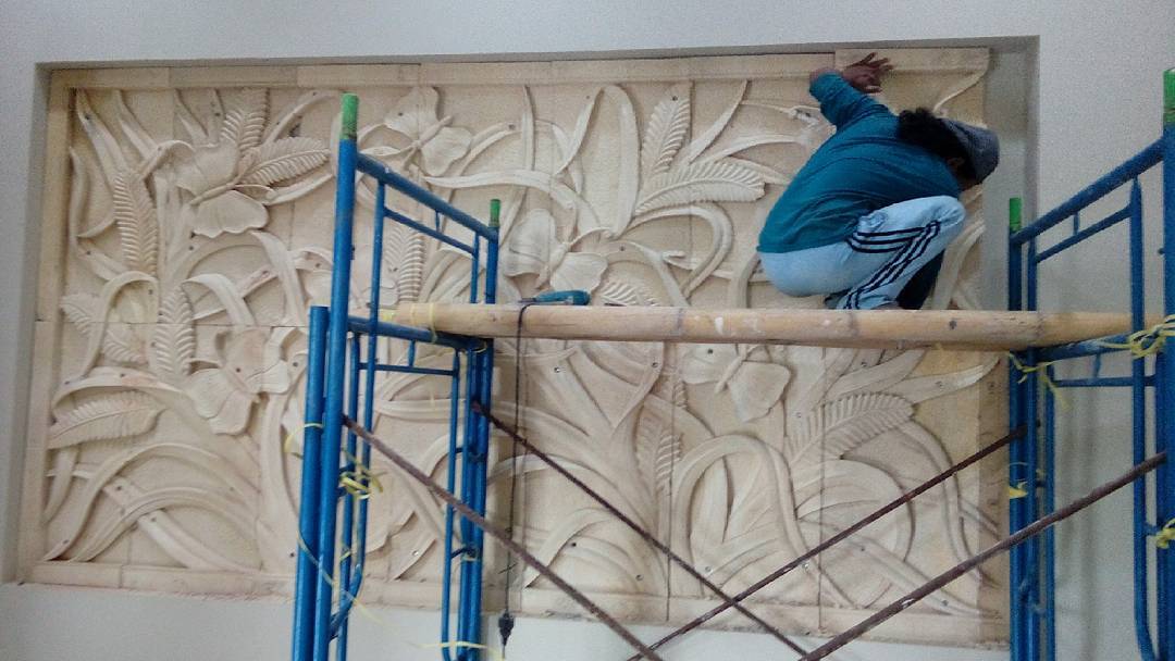 Ukiran relief dinding teras dari batu alam berkualitas, memadukan seni pahat dan keindahan desain untuk menciptakan suasana mewah pada hunian.